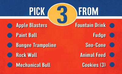 Apple Blasters, Bungee Trampoline, Rock Wall, Mechanical Bull, Fountain Drink, Fudge, Sno-Cone, Pretzel, Cookies (3)